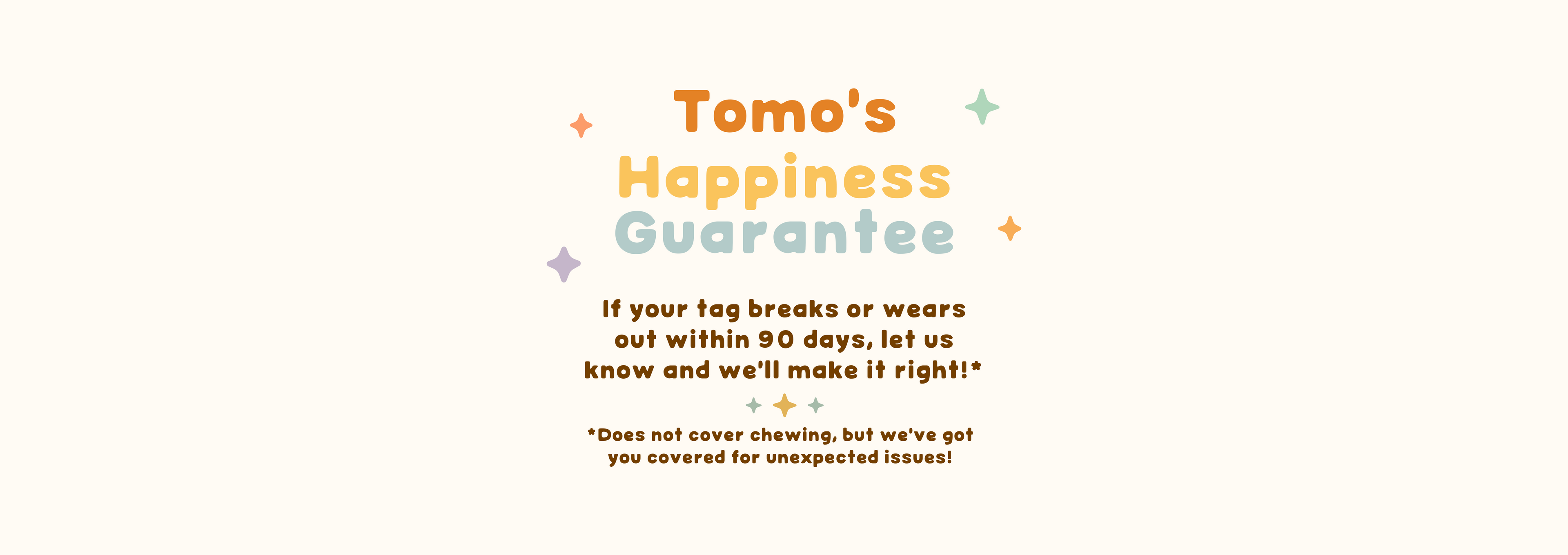 Every tag is backed by a 90-day Happiness Guarantee. If your tag breaks under normal wear and tear, we’ll replace it—no sad tails. Just snap a picture and email us at support@tiny-tomo.com.